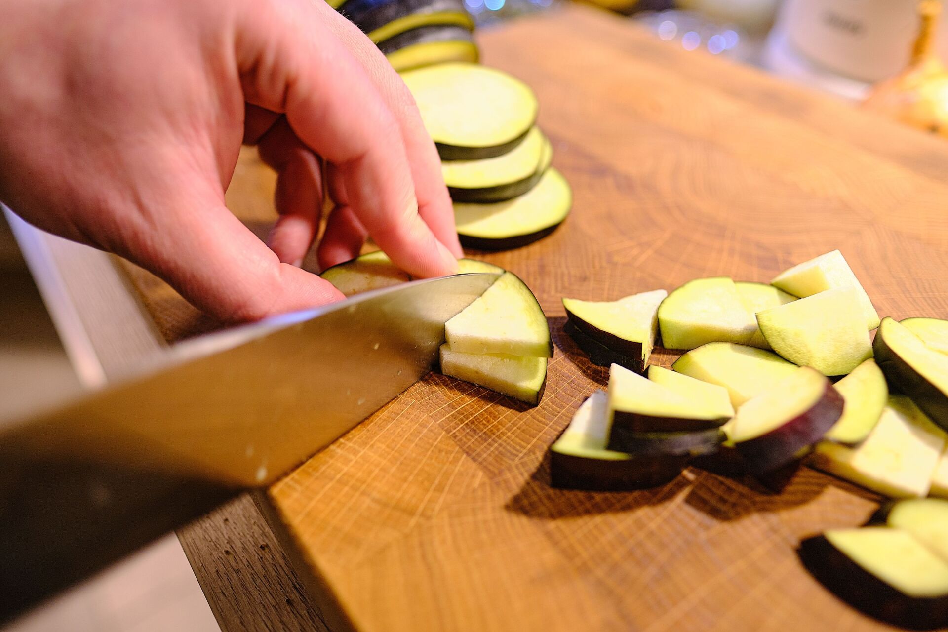- Aubergine in Stücke schneiden, kräftig salzen und in einem Sieb abtropfen lassen, währenddessen alles andere Gemüse fein schneiden. Nach 15 Minuten die Auberginen abtupfen.